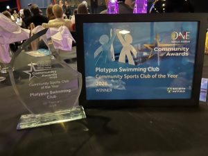 Platypus Swimming Club was thrilled to receive for a second time the ‘Community Sports Club of the Year’ award at the One Welwyn Hatfield Community Awards held on 26th February 2026 at Campus West.  It was a fun evening with a magician, a jazz singer, dinner and a chance to meet other members of the voluntary community.    To win was very special in our Club’s 60th Anniversary Year.  Graeme, our Chairman, Emma, Chris and Karen went up on stage to accept the award on behalf of the Club which was sponsored by Better.  It was an honour to receive the award in recognition of the achievements of the Club, its members and committee.  The event was very well attended with many worthy winners of community awards.
